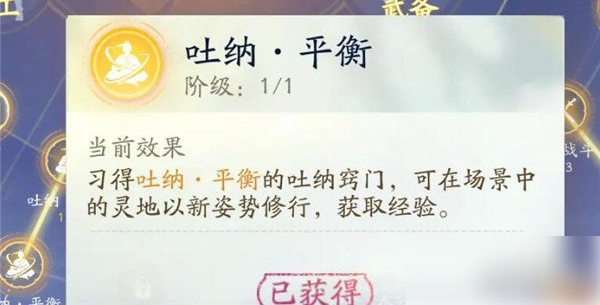 2、游戲中共有兩種吐納技巧,其一為經(jīng)驗(yàn)值提升速度中等的平衡吐納。