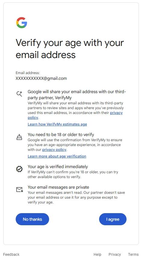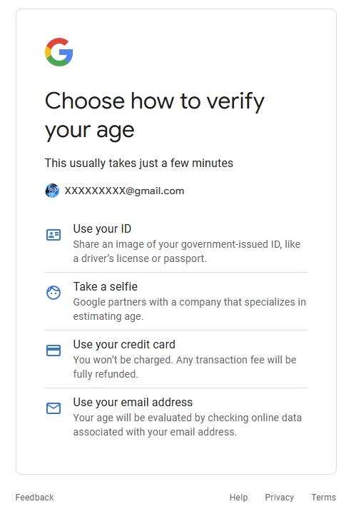 如果選用verifymy.io來驗(yàn)證年齡的話,谷歌會(huì)要求用戶輸入自己的電郵地址,隨后掃描用戶使用相同電郵注冊(cè)、登錄的應(yīng)用和網(wǎng)站,以此推斷用戶的大致年齡,如果驗(yàn)證失敗,系統(tǒng)就會(huì)要求用戶上傳身份證明文件或自拍驗(yàn)證年齡,其中自拍驗(yàn)證應(yīng)用了 AI 技術(shù),機(jī)器可識(shí)別人臉自動(dòng)判斷用戶年齡。